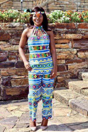 Ladies jumpsuit, sweetheart bodice with spagetty neck line in Ndebele prints suitable for any occasion.